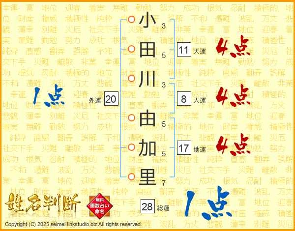 小(3画)田(5画)川(3画) 由(5画)加(5画)里(7画)