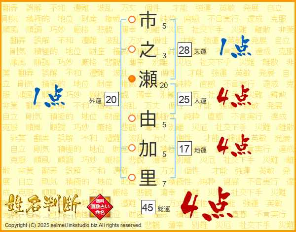 市(5画)之(3画)瀬(20画) 由(5画)加(5画)里(7画)