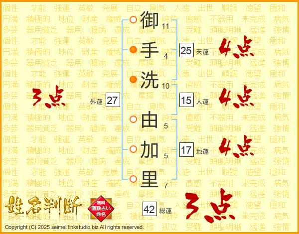 御(11画)手(4画)洗(10画) 由(5画)加(5画)里(7画)