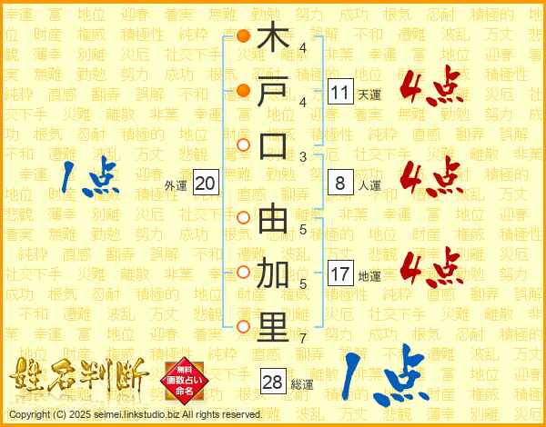木(4画)戸(4画)口(3画)  由(5画)加(5画)里(7画)