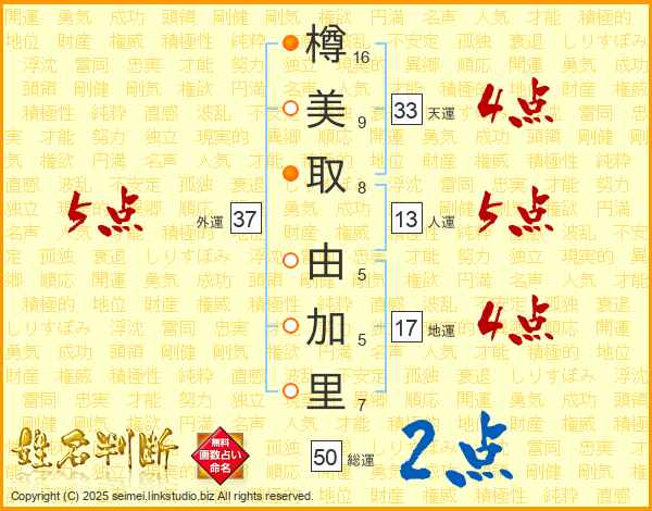 樽(16画)美(9画)取(8画) 由(5画)加(5画)里(7画)