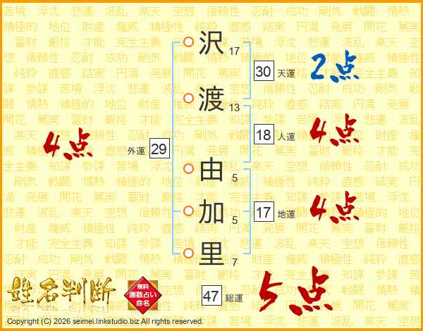 沢(17画)渡(13画) 由(5画)加(5画)里(7画)