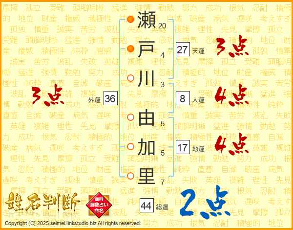 瀬(20画)戸(4画)川(3画) 由(5画)加(5画)里(7画)