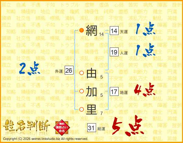 生活面を象徴する運勢です。外部から受ける影響力を表し、結婚運、家庭運や職場、環境への順応性を表します。総運から人運を引いた画数。姓や名が1文字の場合を除く。