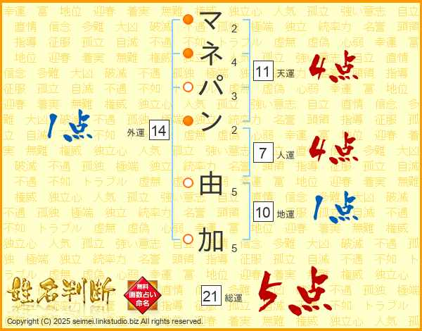 マ(2画)ネ(4画)パ(3画)ン(2画) 由(5画)加(5画)