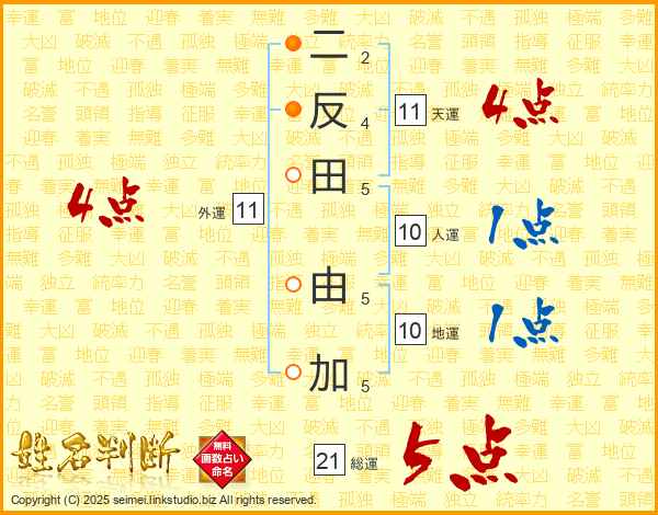 生活面を象徴する運勢です。外部から受ける影響力を表し、結婚運、家庭運や職場、環境への順応性を表します。総運から人運を引いた画数。姓や名が1文字の場合を除く。