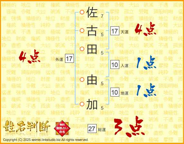 佐(7画)古(5画)田(5画) 由(5画)加(5画)