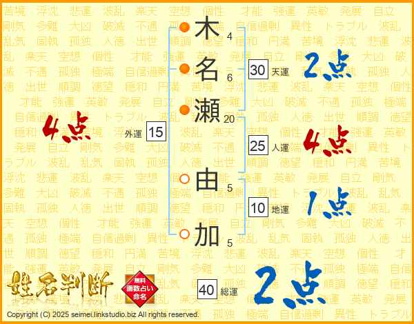 木(4画)名(6画)瀬(20画) 由(5画)加(5画)