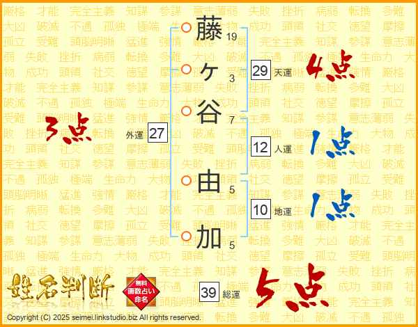 藤(19画)ヶ(3画)谷(7画) 由(5画)加(5画)