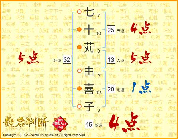 七十苅由喜子さんの総運は45画の4点!
