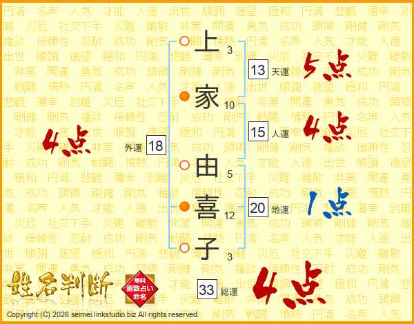 生活面を象徴する運勢です。外部から受ける影響力を表し、結婚運、家庭運や職場、環境への順応性を表します。総運から人運を引いた画数。姓や名が1文字の場合を除く。