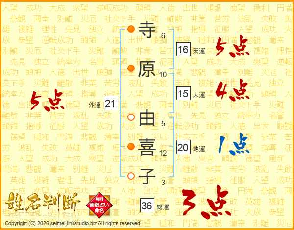 寺(6画)原(10画) 由(5画)喜(12画)子(3画)