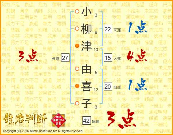 小(3画)柳(9画)津(10画) 由(5画)喜(12画)子(3画)