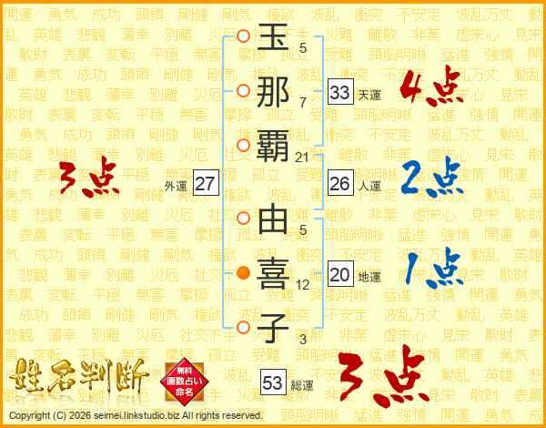 玉(5画)那(7画)覇(21画) 由(5画)喜(12画)子(3画)