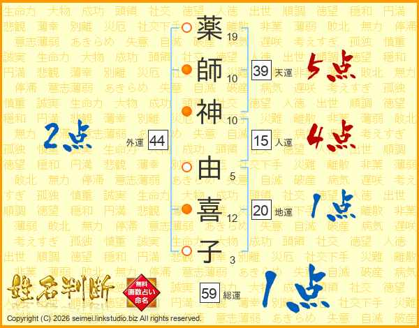 薬(19画)師(10画)神(10画) 由(5画)喜(12画)子(3画)