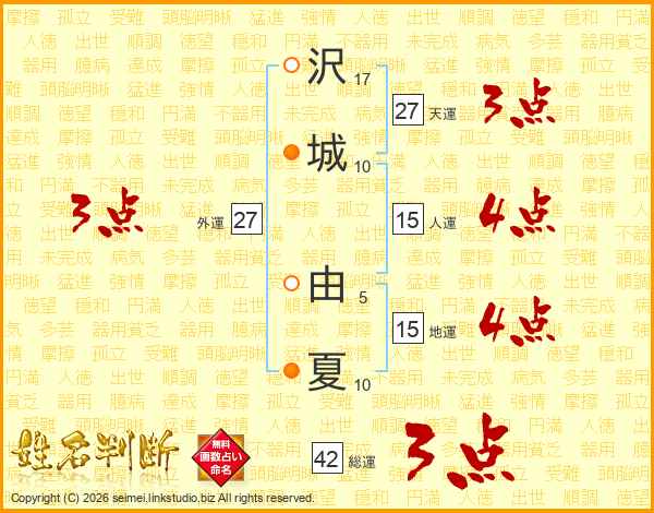 沢(17画)城(10画) 由(5画)夏(10画)