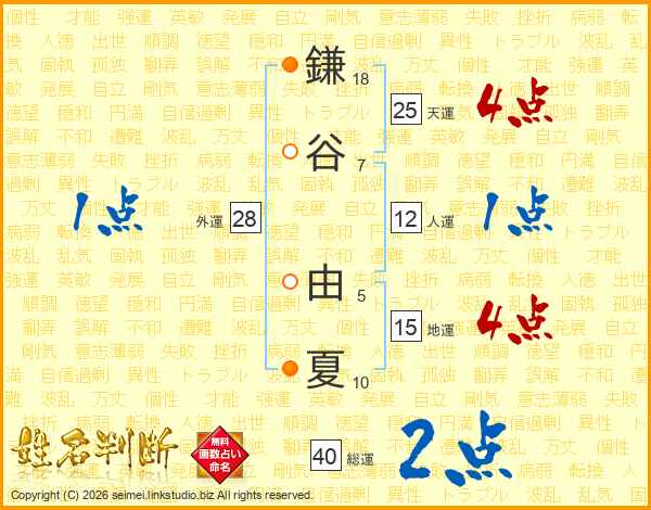 鎌(18画)谷(7画) 由(5画)夏(10画)