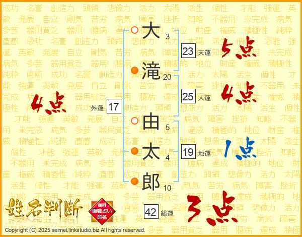 大(3画)滝(20画) 由(5画)太(4画)郎(10画)