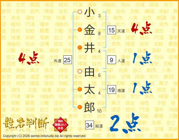 小(3画)金(8画)井(4画) 由(5画)太(4画)郎(10画)