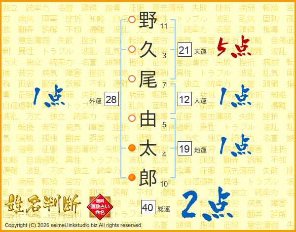 野(11画)久(3画)尾(7画) 由(5画)太(4画)郎(10画)