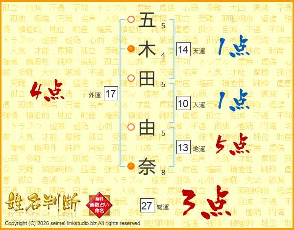 五(5画)木(4画)田(5画) 由(5画)奈(8画)