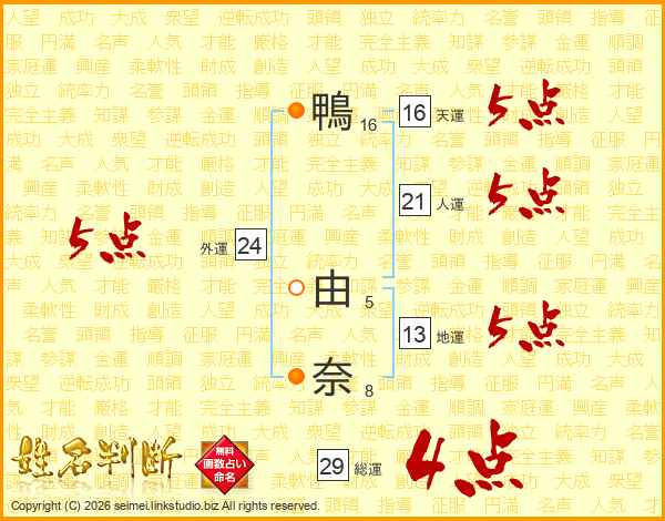 鴨由奈さんの総運は29画の4点!