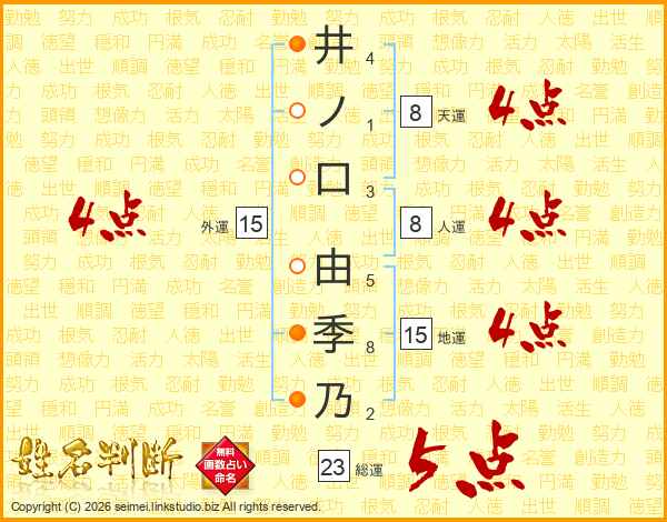 井(4画)ノ(1画)口(3画) 由(5画)季(8画)乃(2画)