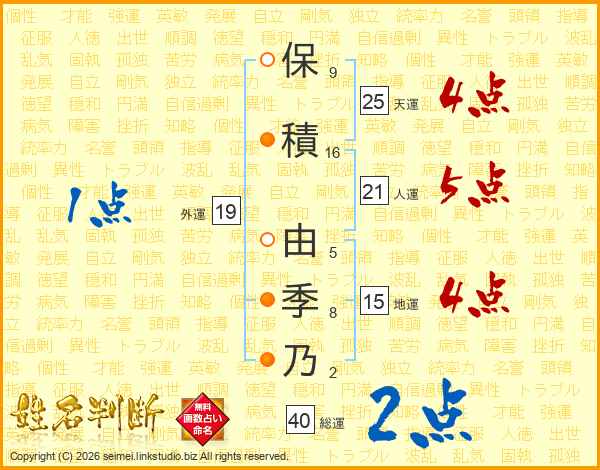 保(9画)積(16画) 由(5画)季(8画)乃(2画)