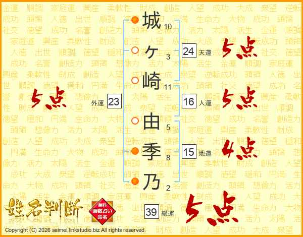 城(10画)ヶ(3画)崎(11画) 由(5画)季(8画)乃(2画)