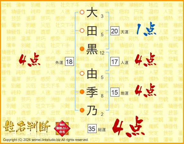 大(3画)田(5画)黒(12画) 由(5画)季(8画)乃(2画)