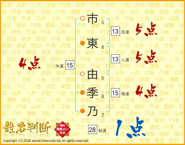市(5画)東(8画) 由(5画)季(8画)乃(2画)