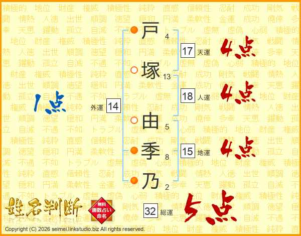 戸(4画)塚(13画) 由(5画)季(8画)乃(2画)