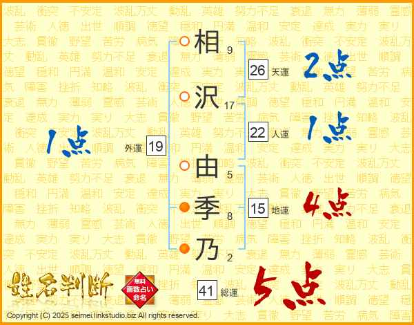 相沢由季乃さんの総運は41画の5点!
