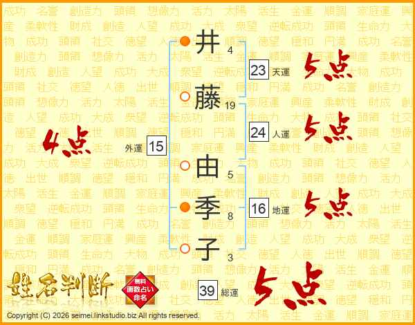 井藤由季子さんの総運は39画の5点!