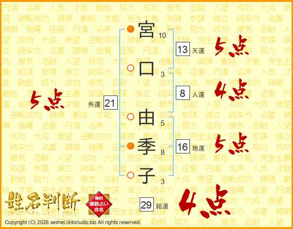 宮口由季子さんの総運は29画の4点!