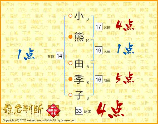 小(3画)熊(14画) 由(5画)季(8画)子(3画)