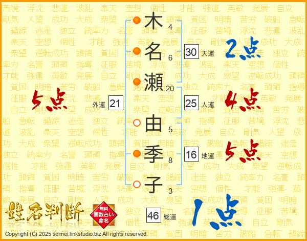 木(4画)名(6画)瀬(20画) 由(5画)季(8画)子(3画)