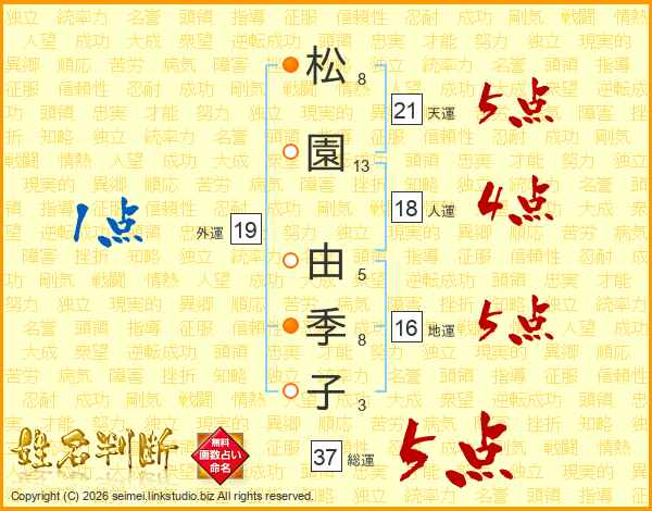 松(8画)園(13画) 由(5画)季(8画)子(3画)