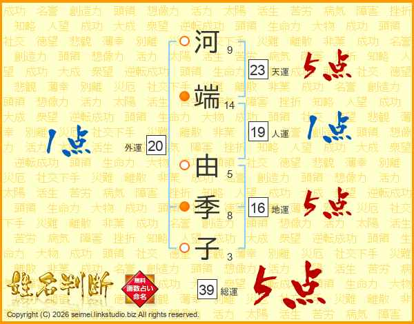 河(9画)端(14画) 由(5画)季(8画)子(3画)