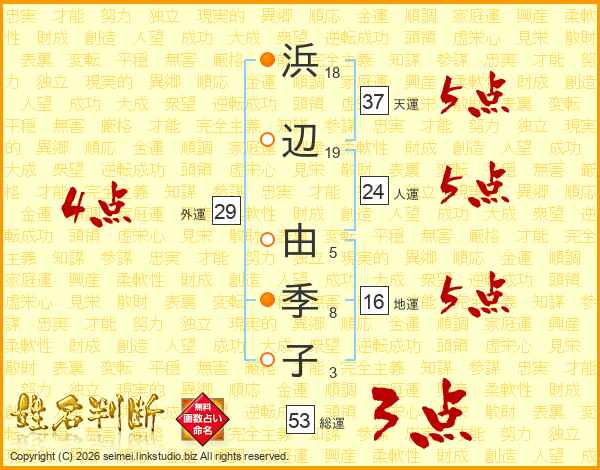 浜(18画)辺(19画) 由(5画)季(8画)子(3画)