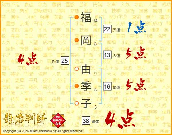 福(14画)岡(8画) 由(5画)季(8画)子(3画)