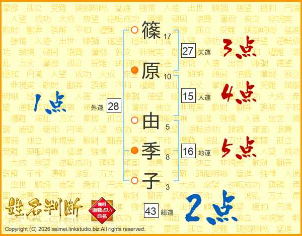 篠(17画)原(10画) 由(5画)季(8画)子(3画)