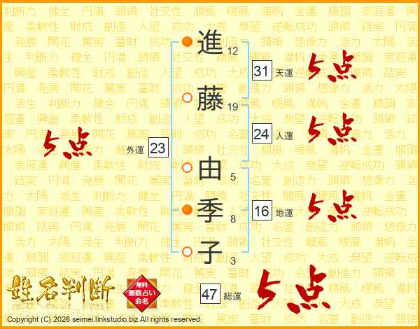 進(12画)藤(19画) 由(5画)季(8画)子(3画)