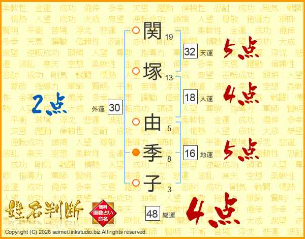 関(19画)塚(13画) 由(5画)季(8画)子(3画)