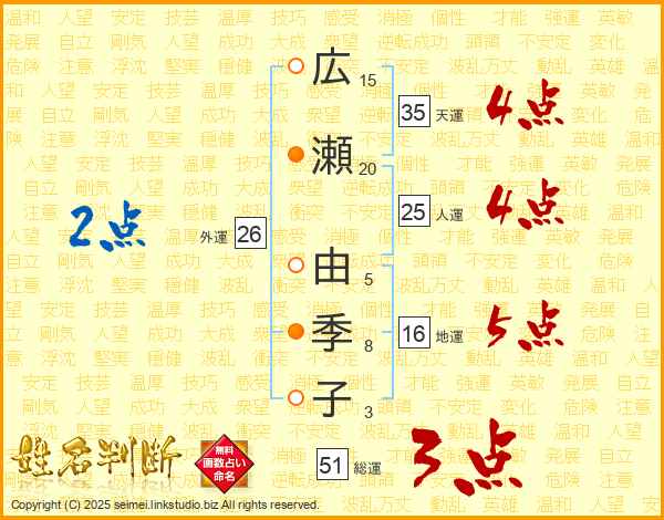 広(15画)瀬(20画) 由(5画)季(8画)子(3画)