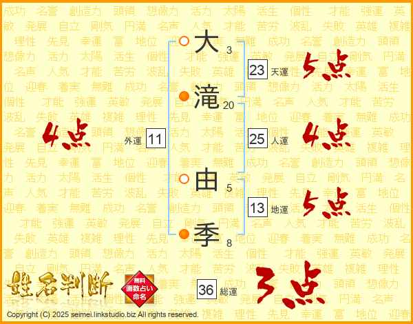 あなたの人生を表す1番重要な運勢です。生涯を通じて影響する総合運となり、主に50歳以降の晩年期に影響を及ぼします。苗字と名前の合計画数。