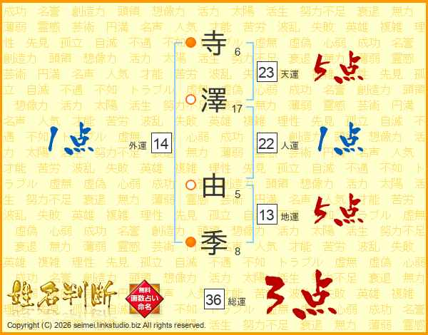 寺(6画)澤(17画) 由(5画)季(8画)