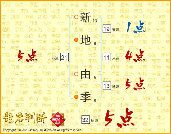 生活面を象徴する運勢です。外部から受ける影響力を表し、結婚運、家庭運や職場、環境への順応性を表します。総運から人運を引いた画数。姓や名が1文字の場合を除く。