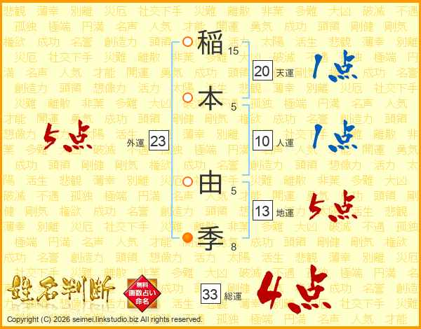 生活面を象徴する運勢です。外部から受ける影響力を表し、結婚運、家庭運や職場、環境への順応性を表します。総運から人運を引いた画数。姓や名が1文字の場合を除く。