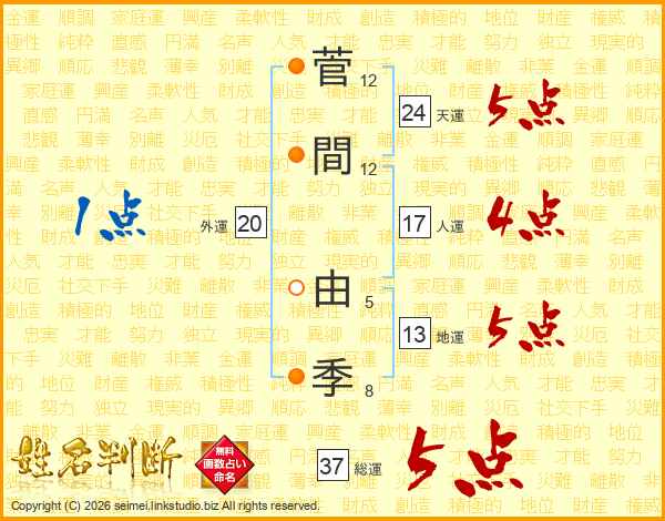 生活面を象徴する運勢です。外部から受ける影響力を表し、結婚運、家庭運や職場、環境への順応性を表します。総運から人運を引いた画数。姓や名が1文字の場合を除く。